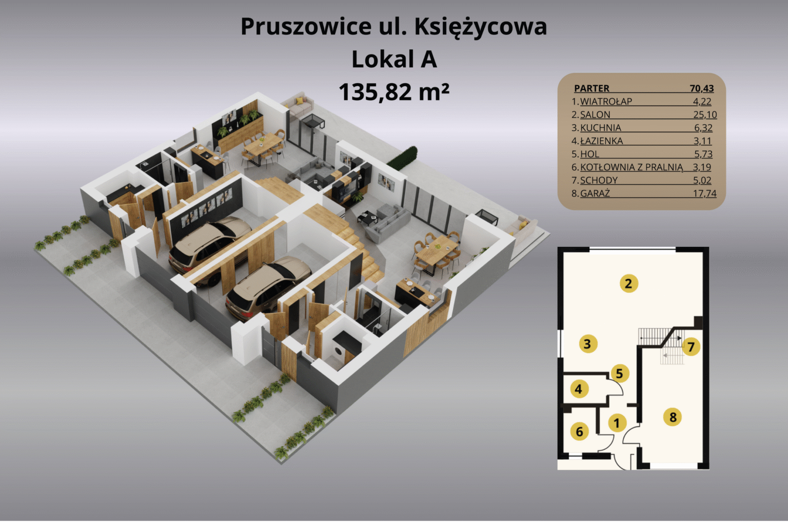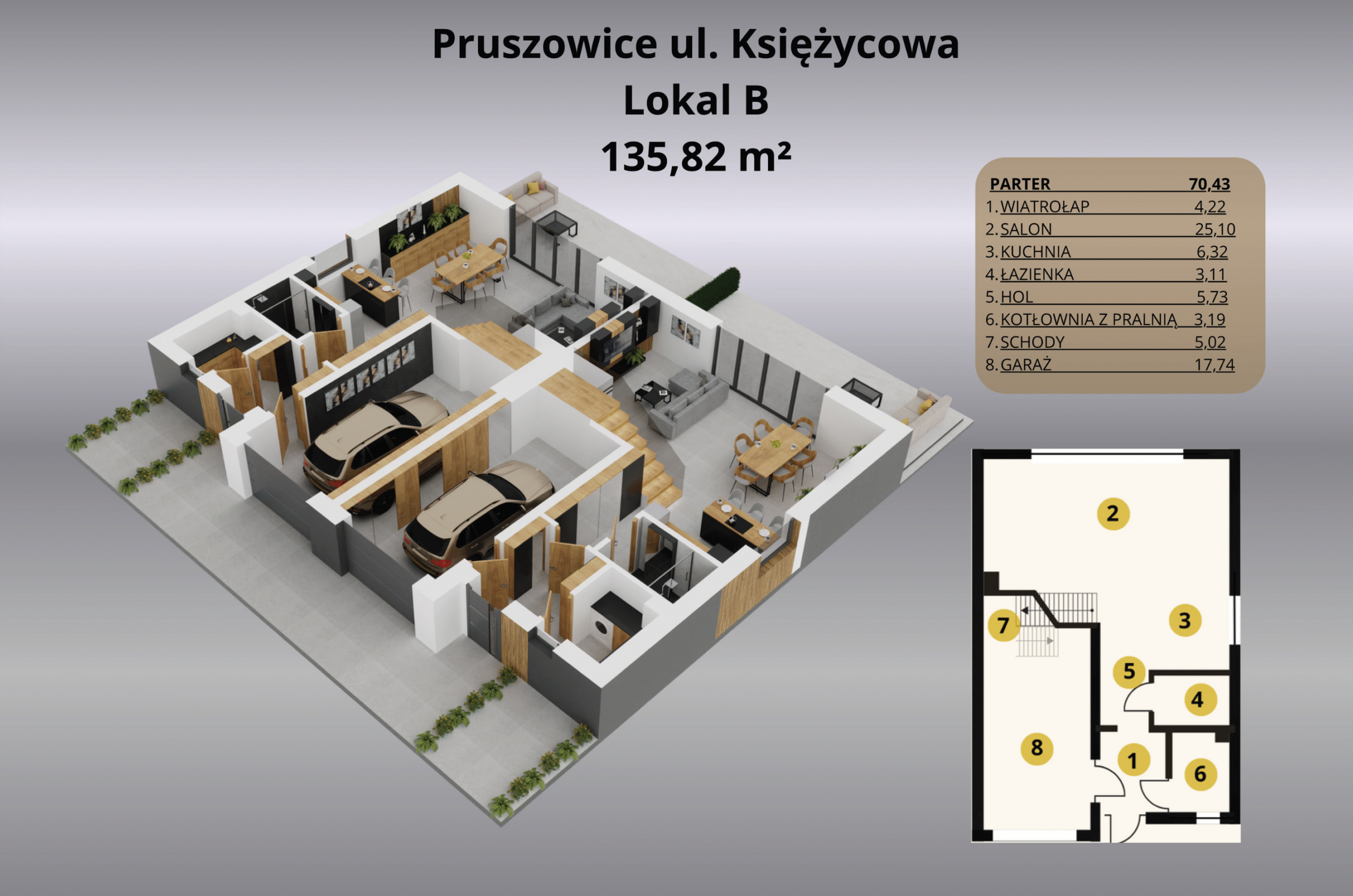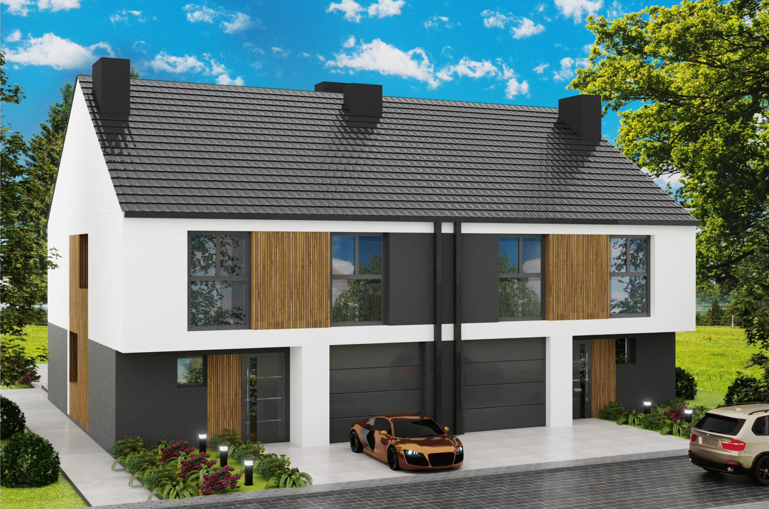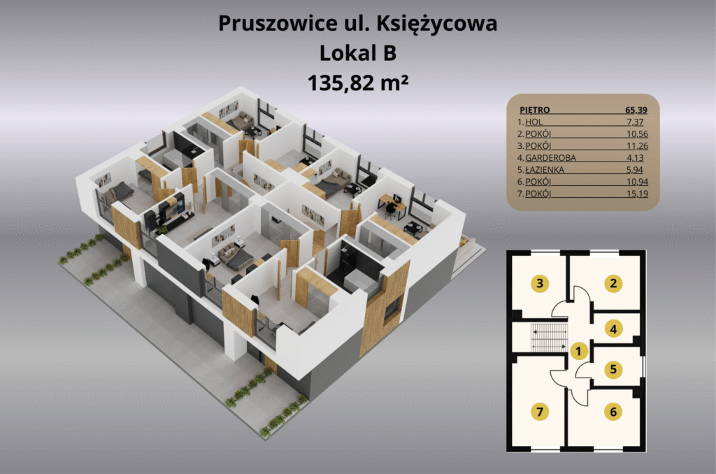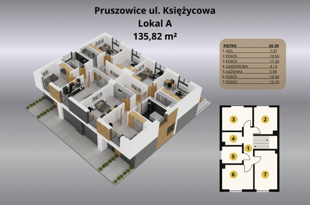 Inwestycja przy ulicy Księżycowej w Pruszowicach to idealne miejsce dla osób, które szukają harmonii między nowoczesnym stylem życia a ciszą i przestrzenią podmiejskiego otoczenia. Domy w zabudowie bliźniaczej o powierzchni 135,82 m² zostały zaprojektowane z myślą o funkcjonalności i komforcie – otwarta strefa dzienna z salonem i kuchnią sprzyja wspólnemu spędzaniu czasu, a duże przeszklenia wpuszczają mnóstwo naturalnego światła.